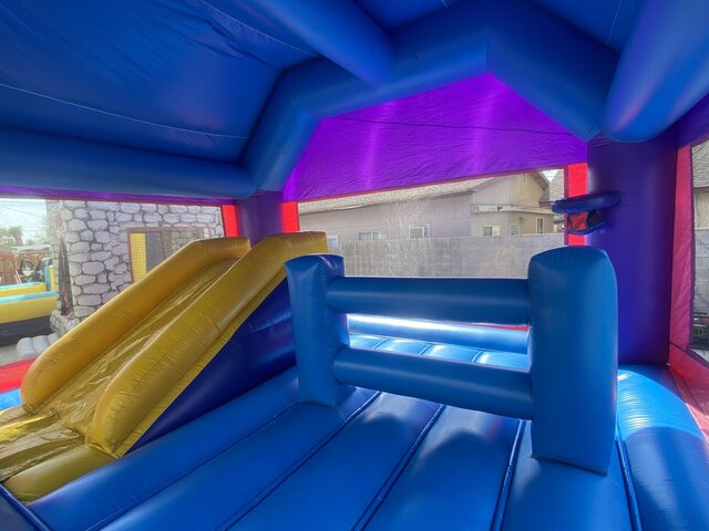 MINI INTERNAL SLIDE, RUN THROUGH BUMPERS, CLIMB OVER BUMPS,2 INFLATED BASKET BALL HOOPS, AND A JUMPER ALL IN ONE.
